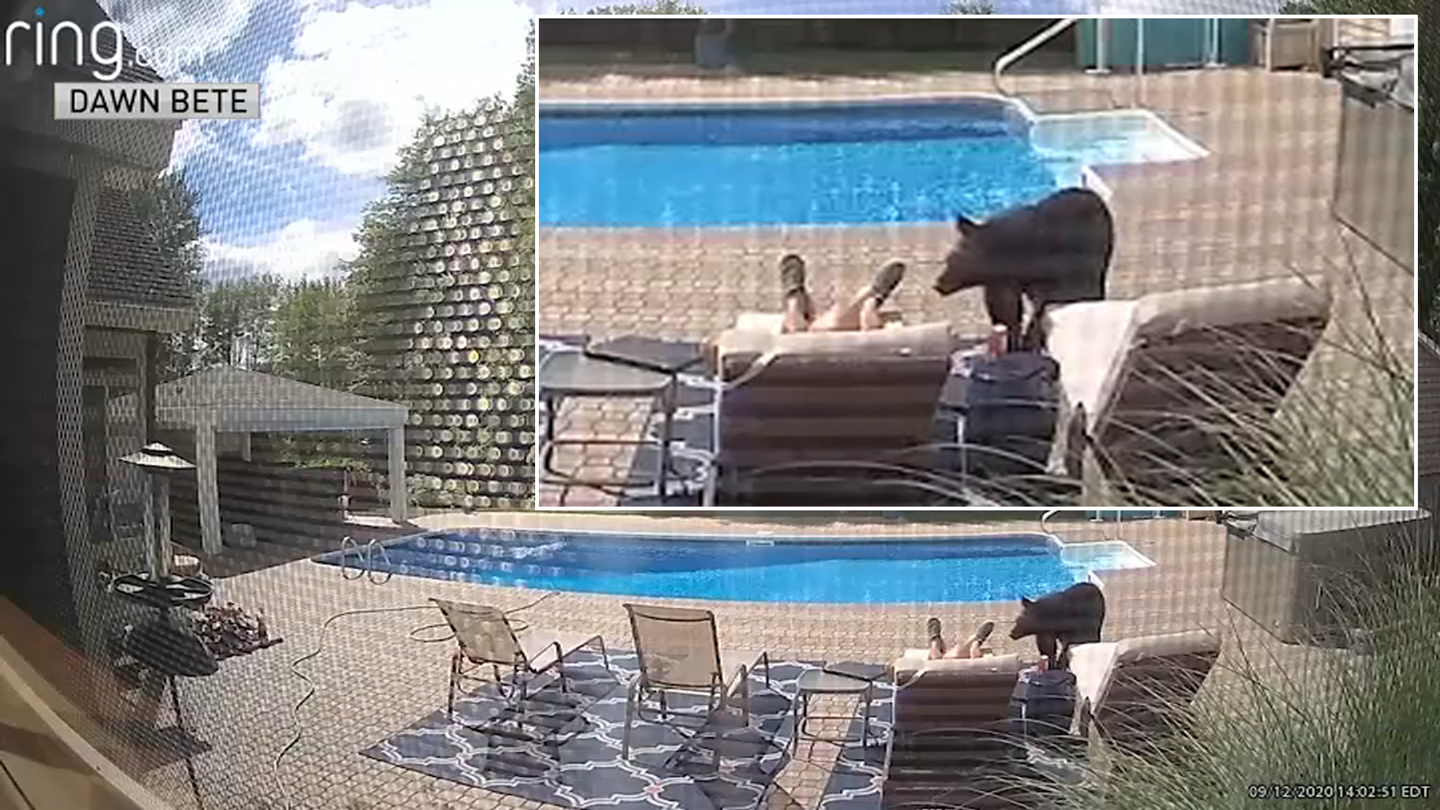 El video de vigilancia de una casa muestra a un hombre descansando junto a una piscina en Greenfield, Massachusetts, sorprendido por un oso curioso este fin de semana. El video fue compartido en Facebook el domingo por Dawn Bete.