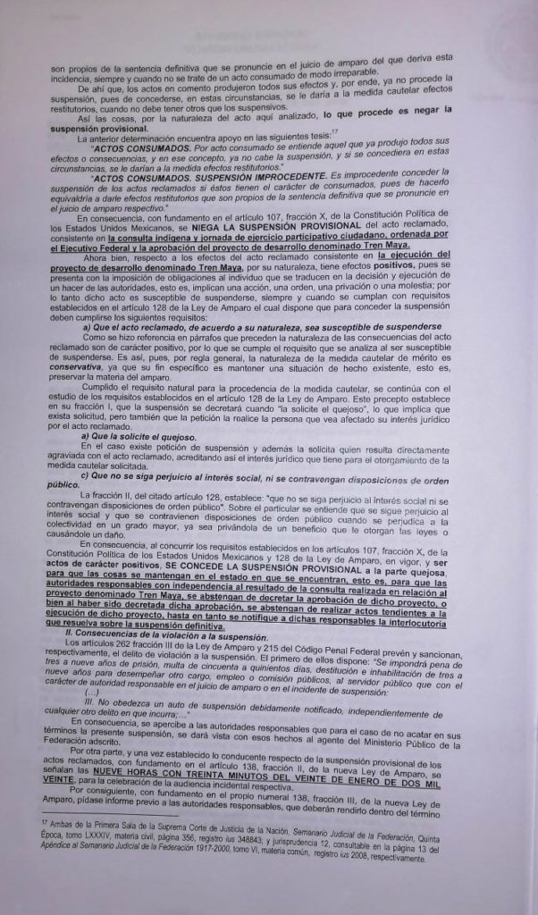 “Se concede la suspensión provisional a la parte quejosa para que las cosas se mantengan en el estado en que se encuentran, esto es, para que las autoridades responsables, con independencia del resultado de la consulta realizada en relación al proyecto denominado Tren Maya, se abstengan de decretar la aprobación de dicho proyecto”, se lee textual.