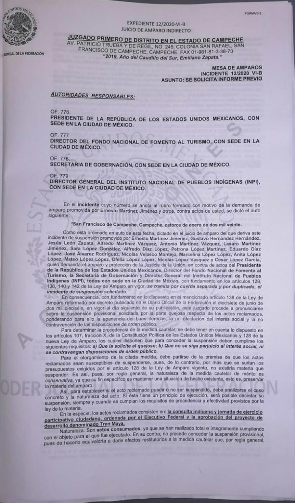 Ernesto Martínez Jiménez, en representación del Consejo, ingresó una demanda el pasado 6 de enero ante el juzgado contra López Obrador, el director del Fondo Nacional de Fomento al Turismo (Fonatur), Rogelio Jiménez Pons; la Secretaría de Gobernación (Segob); y el director del Instituto Nacional de Pueblos Indígenas, Adelfo Regino Montes; mediante la cual solicitó de la Consulta Indígena realizada los días 14 y 15 de diciembre de 2019 y la ejecución del proyecto Tren Maya, que abarca cinco estados del sureste mexicano.