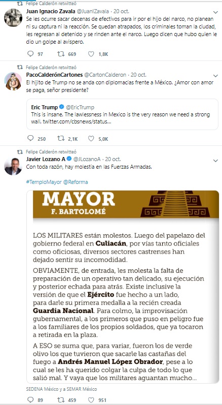 En contraste, tras lo ocurrido en Culiacán la semana pasada, el ex presidente Felipe Calderón no ha emitido una opinión propiamente, pero se ha dedicado a retuitear las críticas o notas que exhiben el fallido operativo: