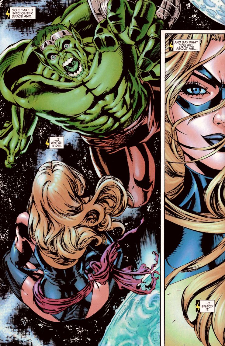 Durante el clímax de Brian Michael Bendis y David Márquez segunda guerra civil, Capitán Marvel lucha contra Iron Man. A pesar de la amistad establecida de Tony Stark con Carol, ella ignora por completo su pasado y aparentemente lo mata. Uno podría pensar que esta falta de control es solo un cambio de carácter por el que pasó Carol después de convertirse en Capitana Marvel. Si bien se volvió menos indulgente como Capitana Marvel, Carol siempre fue despiadada con sus oponentes. Brian Reed y Adriana Melo Sra. maravilla El #28 ejemplifica esto cuando Carol lleva lentamente un Skrull al espacio, flota en un asiento meditativo e invisible y disfruta de la muerte lenta del alienígena. Simplemente no hay forma de que Carol Danvers sea menos mortal o peligrosa que Gamora, She-Hulk o Elektra. Incluso en sus días como Ms. Marvel, donde supuestamente era una heroína más amable y de corazón más puro, todavía aniquiló a todos y cada uno de los oponentes.