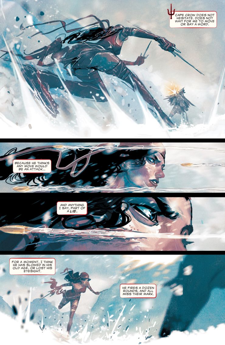 en 2014 Electra #5, por W. Haden Blackman y Mike Del Mundo, la Mujer sin Miedo ejemplifica su instinto asesino. Este extraño poder le otorga a Elektra poderes mentales sobrenaturales, esencialmente mejorando sus habilidades mientras sus oponentes se debilitan. Es capaz de evadir balas a quemarropa, algo que ni siquiera las mejoras cibernéticas de Gamora le permiten hacer. Si bien la fisiología artificial y el factor de curación de Gamora superan las capacidades defensivas de Elektra, Elektra es “más mortal” que Gamora en el sentido de que ha matado fácilmente a cientos de personas, mostrando una habilidad superior con cualquier arma.
