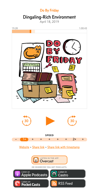Además del lanzamiento de clips, la página para compartir pública de Overcast también recibió una pequeña actualización. Ahora presenta distintivos para otras aplicaciones de podcast y la fuente RSS para el podcast para cualquier programa que se muestre en Apple Podcasts.