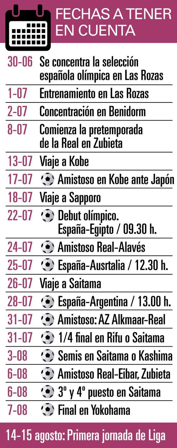 Oyarzabal apenas gozará de descanso. El eibartarra, que tenía previsto incorporarse algo más tarde a la Real para disfrutar de unos días de vacaciones tras la disputa del Europeo, podría incorporarse con tan sólo una semana de vacaciones, la que tuvo entre el final del campeonato liguero y el inicio de la concentración con la selección española. A pesar de todo, el capitán ya dejó claro recientemente que quiere estar en la cita olímpica: “Tengo la ilusión de ir si el seleccionador cuenta conmigo”, dijo. “Todo el mundo cambiaría mi situación por no tener verano”.