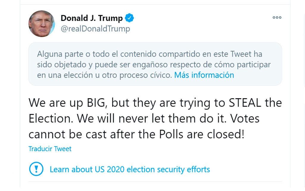 El mensaje del presidente fue amonestado por Twitter, pues la red colocó un mensaje de que la información publicada por el presidente podría contener información engañosa.