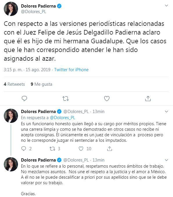 En su cuenta en dicha red social, la legisladora de Morena señaló: “Con respecto a las versiones periodísticas relacionadas con el Juez Felipe de Jesús Delgadillo Padierna aclaro que él es hijo de mi hermana Guadalupe. Que los casos que le han correspondido atender le han sido asignados al azar“.