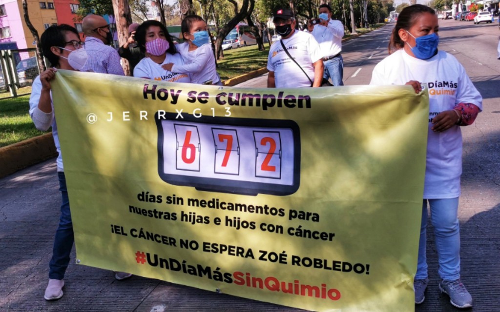 En una manta que portaban se lee: “Hoy se cumplen 672 días sin medicamentos para nuestras hijas e hijos con cáncer. ¡El cáncer no espera Zoé Robledo! #UnDíaMásSinQuimio”.