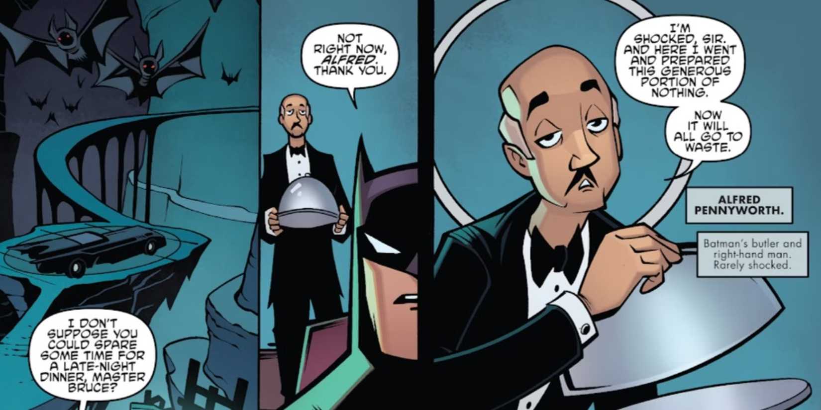 Afortunadamente, no necesitamos simplemente empezar a ignorar este cliché como si nunca hubiera sucedido: podemos solucionarlo. cada uso anterior con un giro. Aquí se explica cómo solucionar el problema: revele que Batman tiene Ha estado comiendo todo el tiempo, consumiendo una especie de batidos o pellets que tienen todos los nutrientes que necesita para combatir el crimen. La razón por la que deja la comida de Alfred es que alteraría el equilibrio perfecto que ha logrado lograr, pero se preocupa demasiado por su padre sustituto como para decírselo. Y, para endulzar la olla, si eres un hombre murciélago escritor de DC Comics que está considerando mostrarle cómo saltarse una comida, ponerse en contacto y Yo personalmente te pagaré 50¢ por no. Vale, “buen dinero” podría haber sido una exageración…