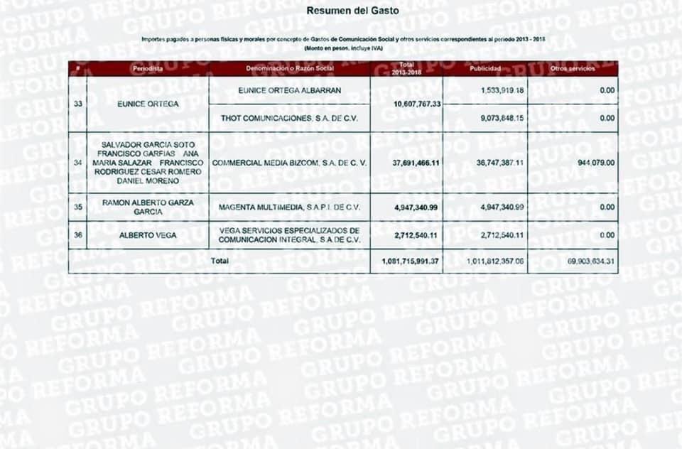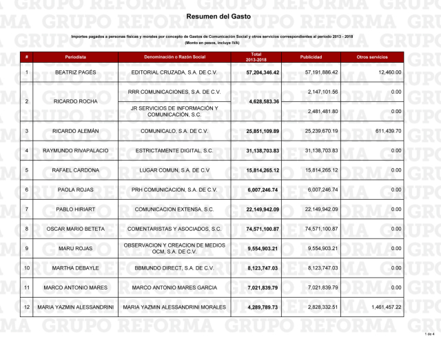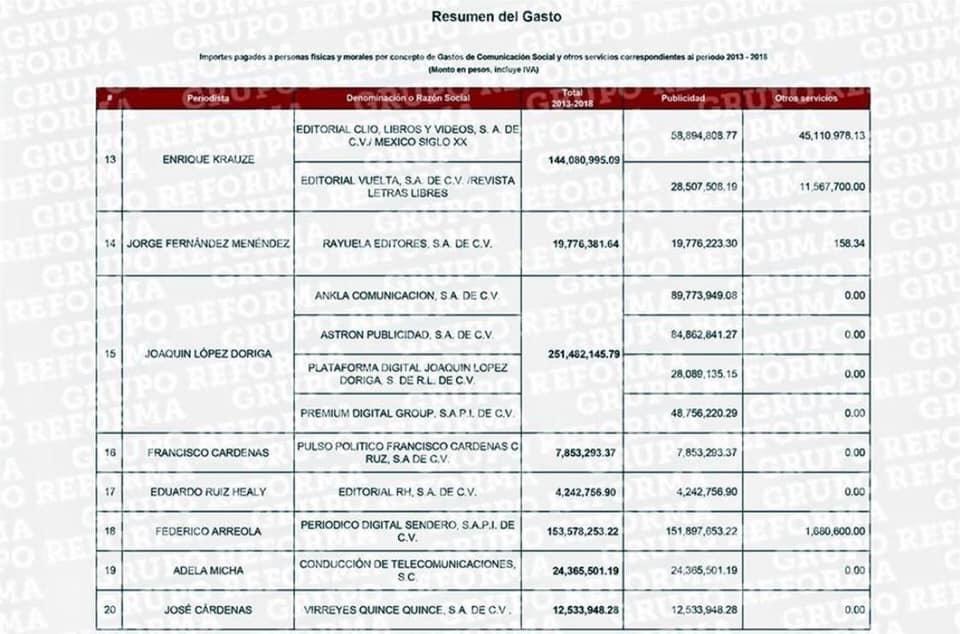 El diario Reforma tuvo acceso a una lista que divulgó la Presidencia de la República sobre periodistas y sus empresas que recibieron contratos millonarios durante el gobierno de Enrique Peña Nieto.