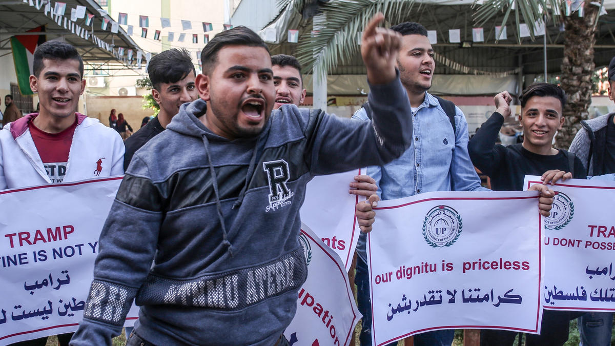 Los manifestantes portaban carteles con las leyendas, “Trump a juicio político, (el primer ministro israelí Benjamin) Netanyahu a la cárcel. Se irá la ocupación y nosotros permaneceremos en nuestra tierra”.