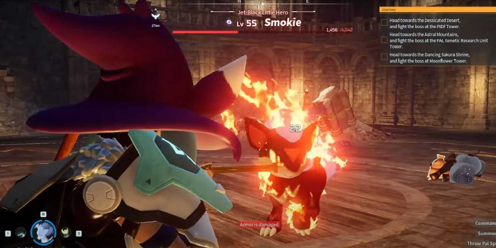 Deberías detectar el Alpha Smokie por las características llamas negras de la criatura, pero ten cuidado al acercarte a él una vez que lo veas. Este El jefe aparece dentro del Reino Sellado del Pequeño Héroe.una ubicación a la que solo puedes acceder una vez que reúnes fichas de recompensa de otros Alpha Pals derrotados. Para llegar a la ubicación de este Alpha Pal en mundo palprimero debes vencer a estas otras criaturas: