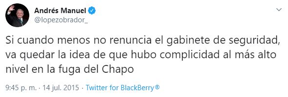 Por lo anterior, insistió en la renuncia de todos los funcionarios que participaron el fallido operativo de Culiacán, Sinaloa, en coherencia con lo que pidió en 2015 López Obrador, quien había dicho que la fuga del Chapo Guzmán ameritaba la renuncia de todo el gabinete de seguridad, de ese entonces.