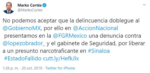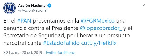 A través de un comunicado, el presidente nacional del albiazul, Marko Cortés, indicó que la querella fue presentada el viernes 18 de octubre por el área jurídica del PAN, para que sean investigados diversos hechos que pudieran considerarse como delitos cometidos durante el operativo federal que logró la captura y posterior liberación del hijo de Joaquín, el Chapo, Guzmán.