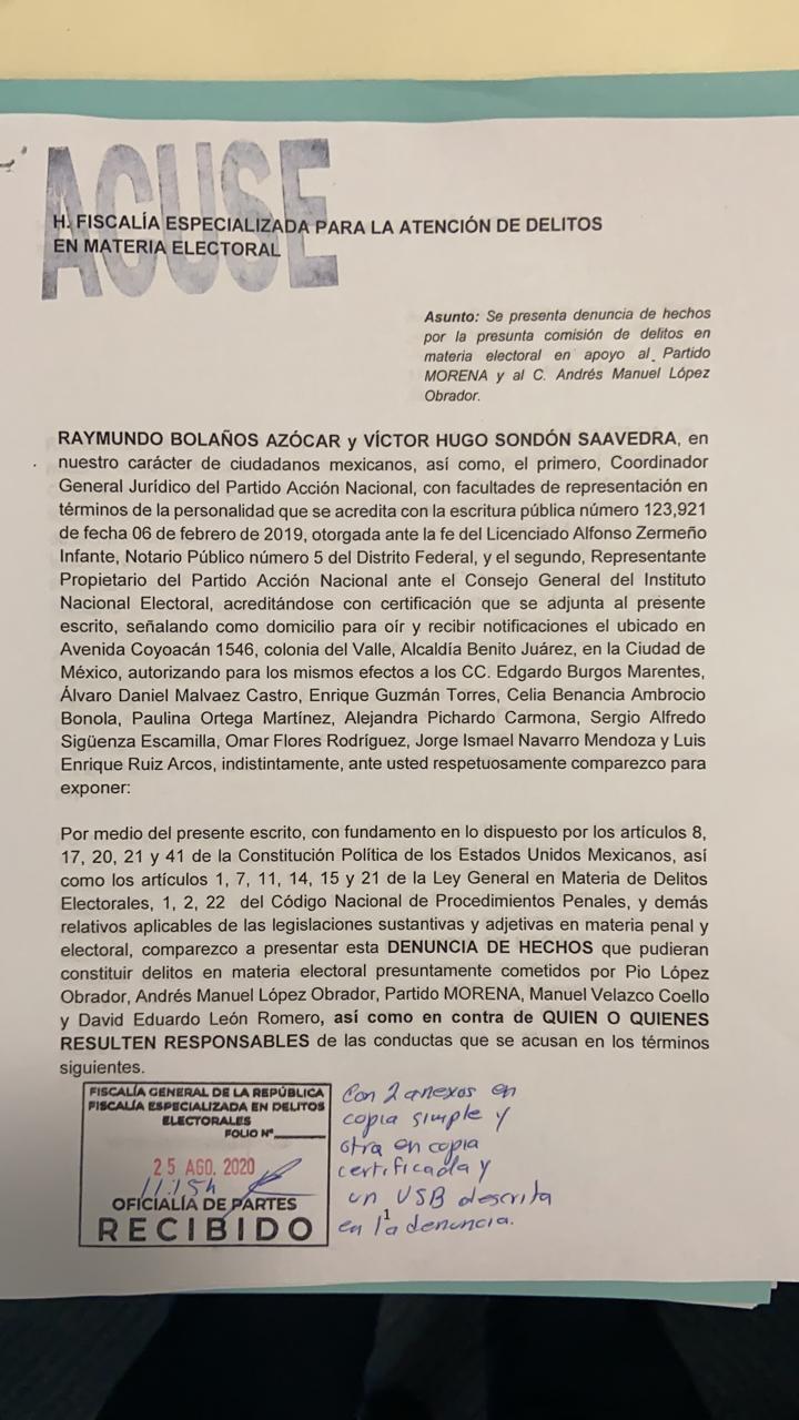 La presentación fue realizada por el director General Jurídico del CEN, Raymundo Bolaños; y el representante del PAN ante el INE, Víctor Hugo Sondón, luego de que el pasado 20 de agosto se dieron a conocer videos y audios en los que presuntamente aparece Pío López Obrador recibiendo dinero en efectivo para financiar a Morena y a su entonces candidato presidencial.