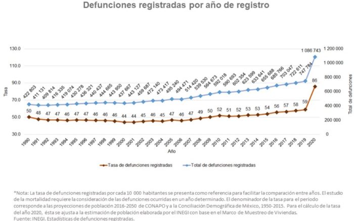Si bien para 2020 las defunciones registradas son 1 086 743, esta cifra contempla fallecimientos de registro extemporáneos, por lo que las defunciones ocurridas entre enero y diciembre de 2020 son 1 076 417 y el complemento extemporáneo o no especificado es de 10 326.