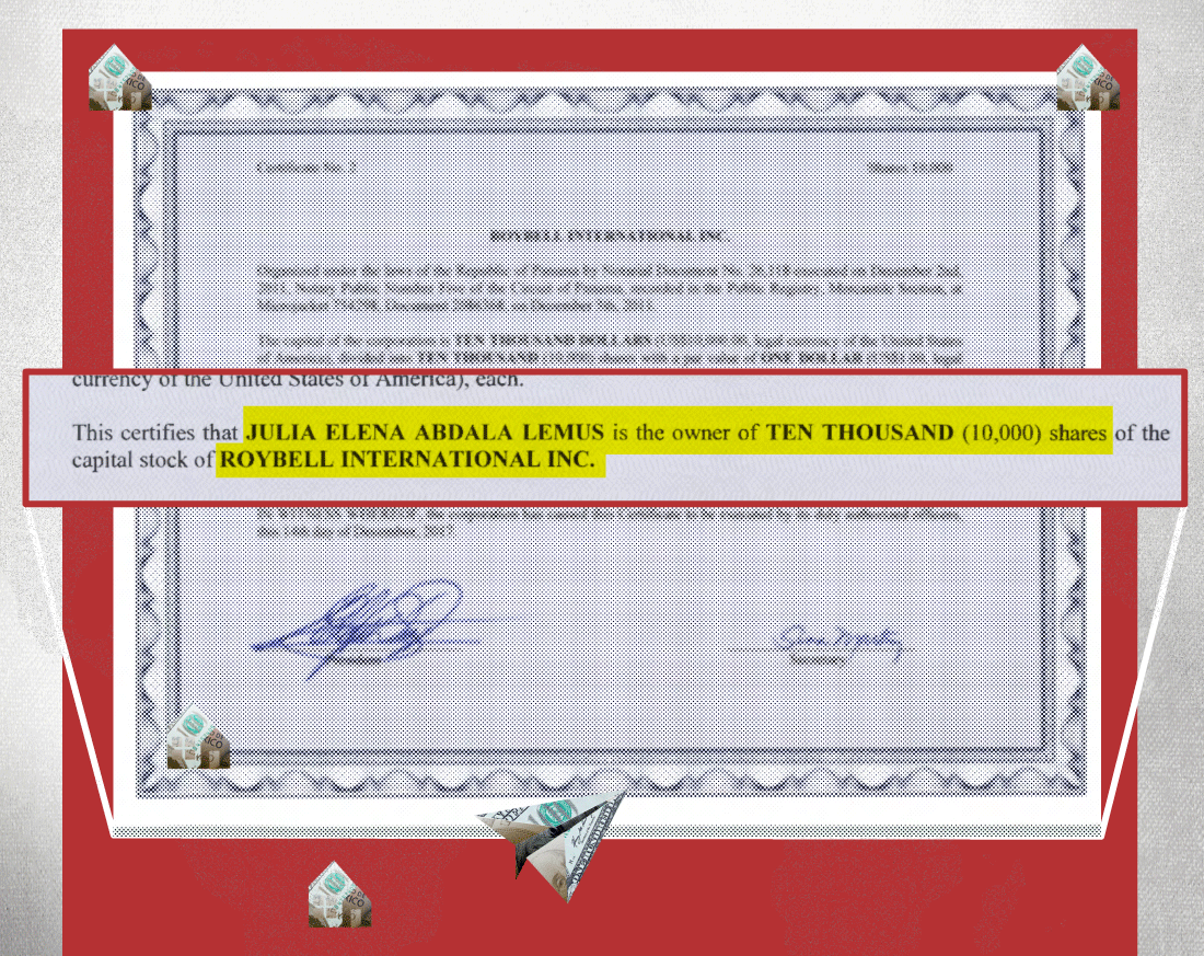 Certificado que muestra a Julia Abdala como propietaria de un paquete accionario en la offshore en Panamá.