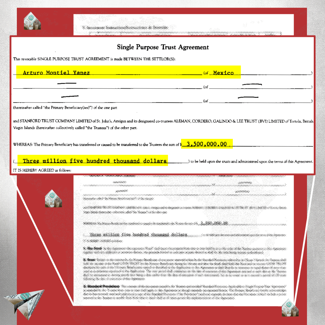 A sus 33 años, el empresario y primogénito del exgobernador celebró un contrato con Alcogal y Stanford Trust para cederles la gestión de 3.5 millones de dólares en beneficio de sus hijos Arturo y Santiago Montiel Ferreyra, según el documento firmado el 8 de septiembre de 2005 que dio origen al fideicomiso Art Saint Trust.