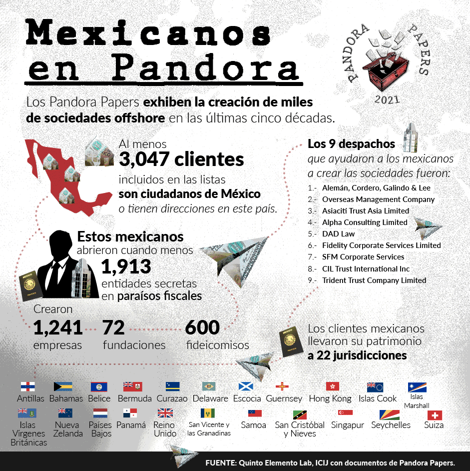 Una revisión de muchos meses realizada por periodistas de Quinto Elemento Lab, El País, Proceso y Univisión a los Pandora Papers permitió conocer que más de 3 mil mexicanos o residentes de México participan en 1,241 sociedades anónimas, 600 fideicomisos y 72 fundaciones difíciles de rastrear situadas en 22 jurisdicciones del mundo.