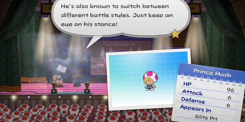 Como el primer campeón del Glitz Pit en Paper Mario: TTYDEl Príncipe Mush se opone. Es importante tener en cuenta que su HP alcanza un máximo de 96 con una estadística de ataque y defensa de 6. Puede causar un daño significativo con su combo de patadas y crear ilusiones de sí mismo durante toda la pelea. Afortunadamente, se le puede desafiar varias veces en un intento de derrotarlo.