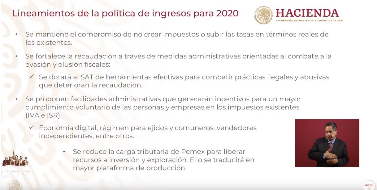 Asimismo, determinó los lineamientos de la política de ingresos 2020, los cuales tienen que ver con mantener el compromiso de no crear impuestos o subir las tasas en términos reales de los existentes, fortalecer la recaudación a través de medidas administrativas orientadas al combate a la evasión fiscales, y proponer facilidades administrativas que generarán incentivos para un mayor cumplimiento voluntario de las personas y empresas en los impuestos existentes (ISR e IVA).