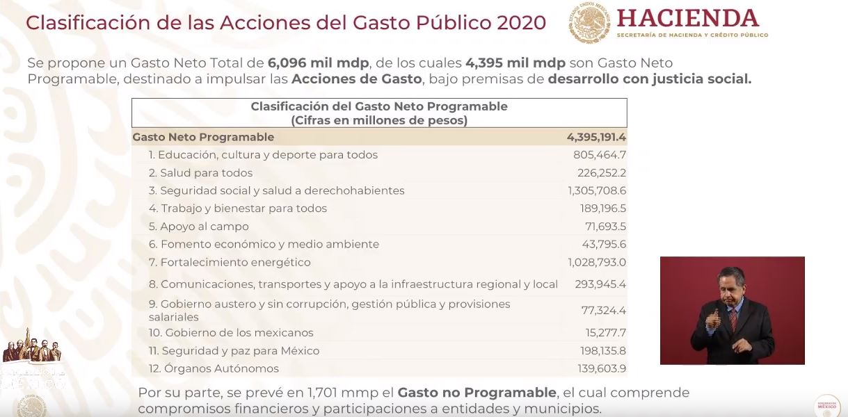 “Con esto tenemos estimado un total de ingresos que para el año 2020 asciende a casi 6.1 billones de pesos, de los cuales 5,511.9 mmdp son de ingresos presupuestales y 584.5 mmdp son de ingresos provenientes del financiamiento”, indicó.