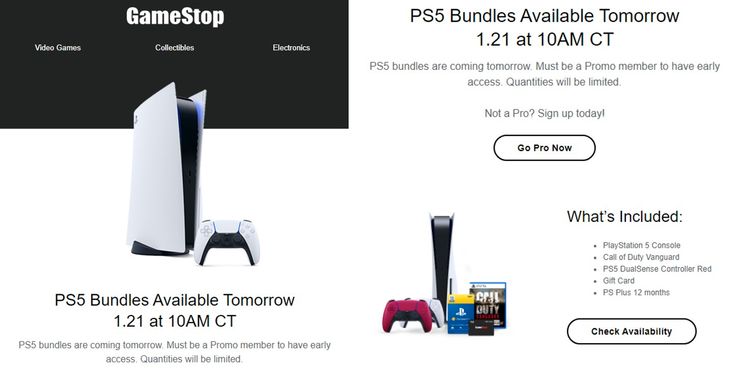 GameStop ha anunciado a través de un comunicado de prensa que los paquetes de PS5 estarán disponibles a las 10 a. m. CT el 21 de enero de 2022. GameStop dice que las cantidades son limitadas y que los miembros de GameStop PowerUp Rewards Pro tendrán acceso anticipado a los paquetes. Los paquetes incluirán una consola PlayStation 5, Call of Duty: Vanguardia, un controlador PS5 DualSense rojo, una tarjeta de regalo y doce meses de PS Plus.