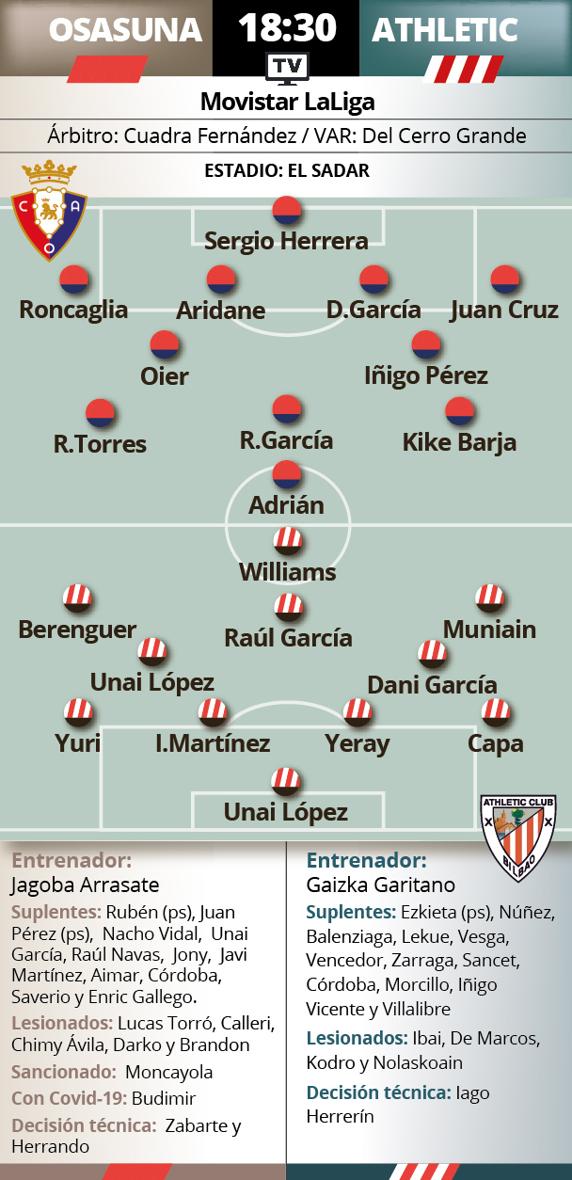 Y hoy también tendrá que estarlo, aunque lo mismo se puede decir de Osasuna con respecto al Athletic, al que parece que los 15 días de parón han dado el aporte vitamínico que necesitaba, en especial Williams, que puede ser decisivo en Iruñea como ya lo fue el año pasado con el gol que abrió el marcador. Estando en modo moto la ‘pantera’ será referencial a poco que sepa sacar partido a las peinadas de Raúl García o que alguien explote su velocidad al hueco.