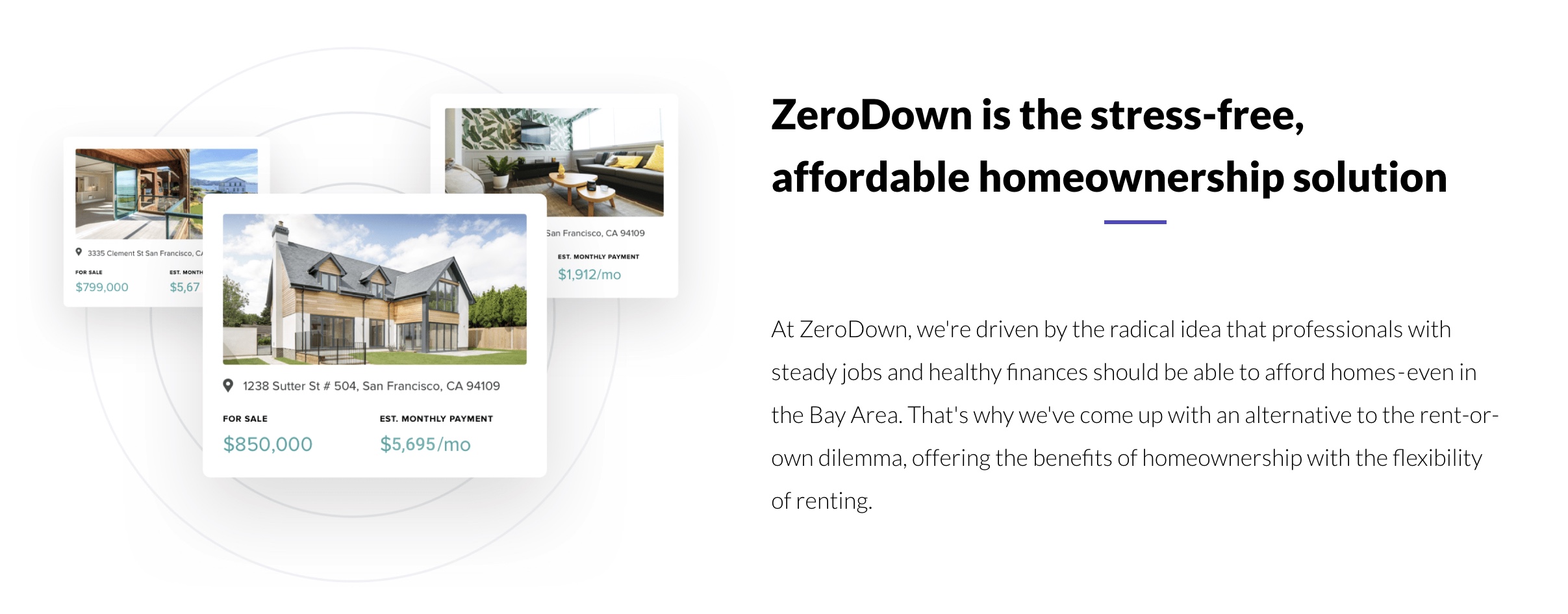 Sin requerir un pago inicial, ZeroDown compra casas directamente para los clientes y les ayuda a trabajar para ser propietario con pagos mensuales determinados por sus ingresos. El negocio fue fundado por Zenefits. el co-fundador y ex director de tecnología Laks Srini, ex jefe de operaciones de Zenefits, Abhijeet Dwivedi, y Hari Viswanathan, ex ingeniero de personal de Zenefits.