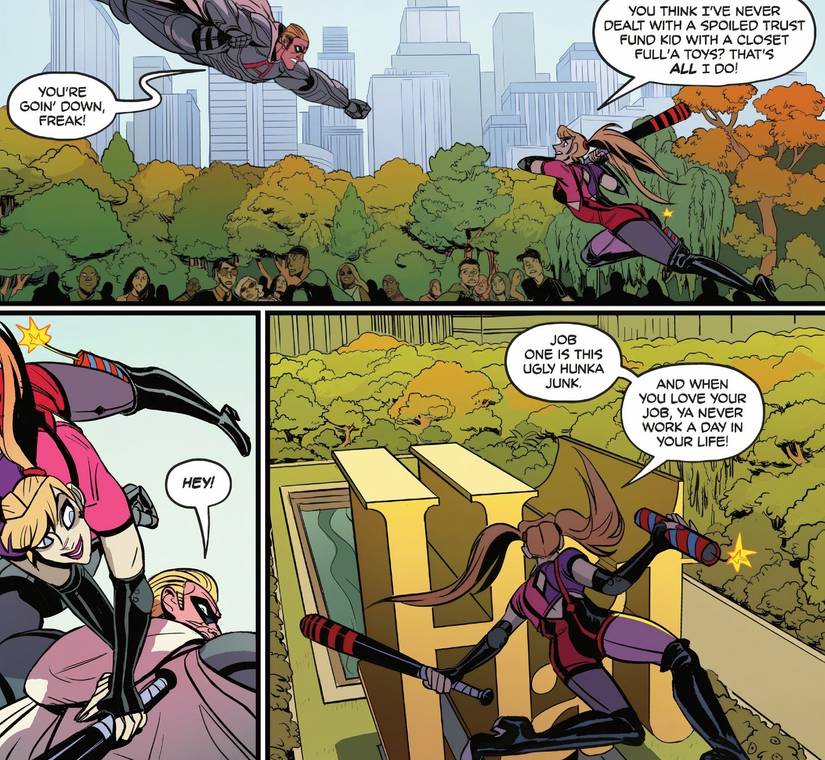 En harley quinn #45 de Elliott Kalan, Mindy Lee, Tríona Farrell y Lucas Gattoni, Harley Quinn abraza nuevamente la villanía para combatir la gentrificación del vecindario Throatcutter Hill de Gotham. Una empresaria llamada Althea ha librado a Throatcutter del crimen con la ayuda de su propio superhéroe, Amenity. Cuando Harley lucha contra Amenity, hace una comparación directa entre él y Batman: “¿Crees que nunca he tratado con un niño mimado de un fondo fiduciario con un armario lleno de juguetes? ¡Eso es todo lo que hago!