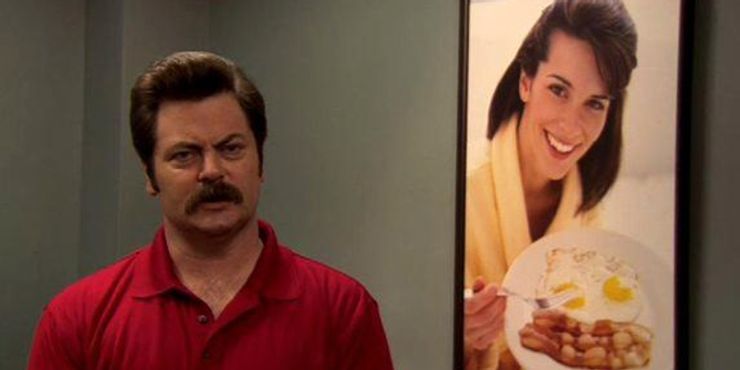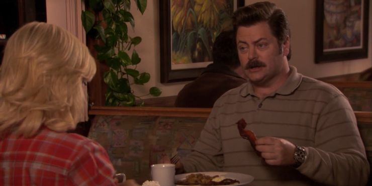 En una relación parques y recreación los fanáticos sabían que estaba condenado desde el principio, Ron está de regreso con Tammy. Mientras muestra la foto de archivo enmarcada de una mujer con comida para el desayuno que está colgada en su oficina, Ron da esta línea icónica y divertida. Luego dice que consiguió algo real esta mañana con Tammy.