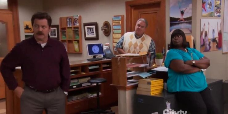 El estilo de gestión laxo de Ron, especialmente en contraste con los métodos prácticos de Leslie, es un poco hilarante a lo largo de la serie. Quiere que sus empleados no hagan nada y no quiere ayudarlos de ninguna manera. Como Ron dice muchas veces a lo largo del programa, su lugar de trabajo ideal es uno donde no se hace nada.