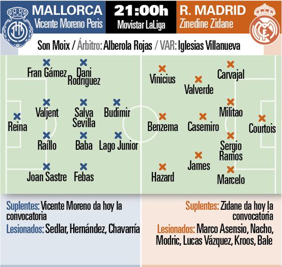 El Mallorca, por su parte, ha trabajado estos días su autoestima para intentar doblegar al Real Madrid y, sobre todo, frenar la sangría en Son Moix. Los bermellones han dejado escapar siete de los últimos nueve puntos disputados en su estadio. Vicente Moreno, entrenador del Mallorca, probablemente recurrirá al once que viene alineando desde Segunda B, con la única excepción del ex madridista Aleix Febas y es casi segura la ausencia en el once del japonés T