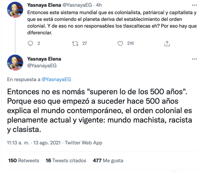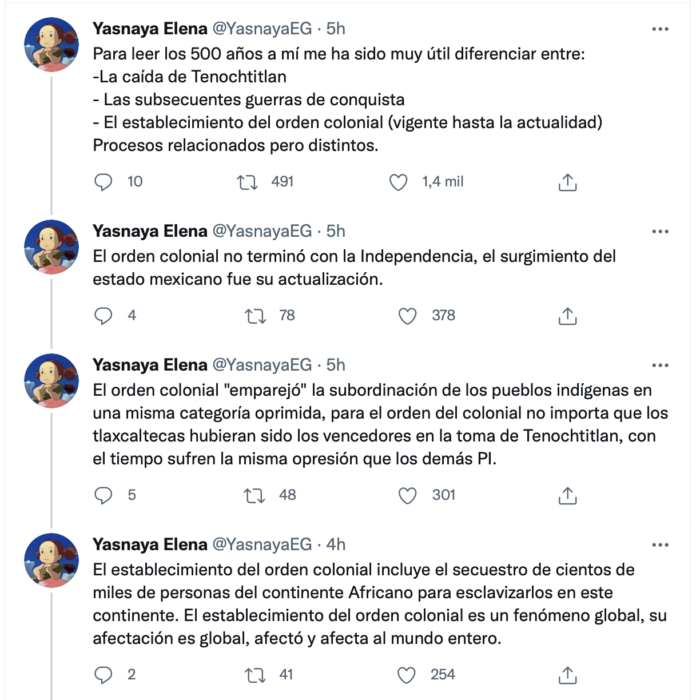 En este contexto la lingüista Yásnaya Elena publicó un hilo en el que hace un análisis de los 500 años: