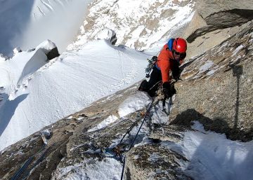 Sobre hielo, la progresión es más sencilla y las protecciones evidentes, pero en ausencia de hielo, la pareja se enfrentó a varios largos en mixto precario: un tapiz de nieve que tapa la roca y que obliga a un tremendo esfuerzo de concentración para no caer y para protegerse. “Hay un punto, a mitad de la ruta, de no retorno. Desde ahí, ya no puedes bajarte, y todas tus opciones pasan por la cima”, dice Torralles.Alcanzaron la cumbre tras cuatro días de escalada.