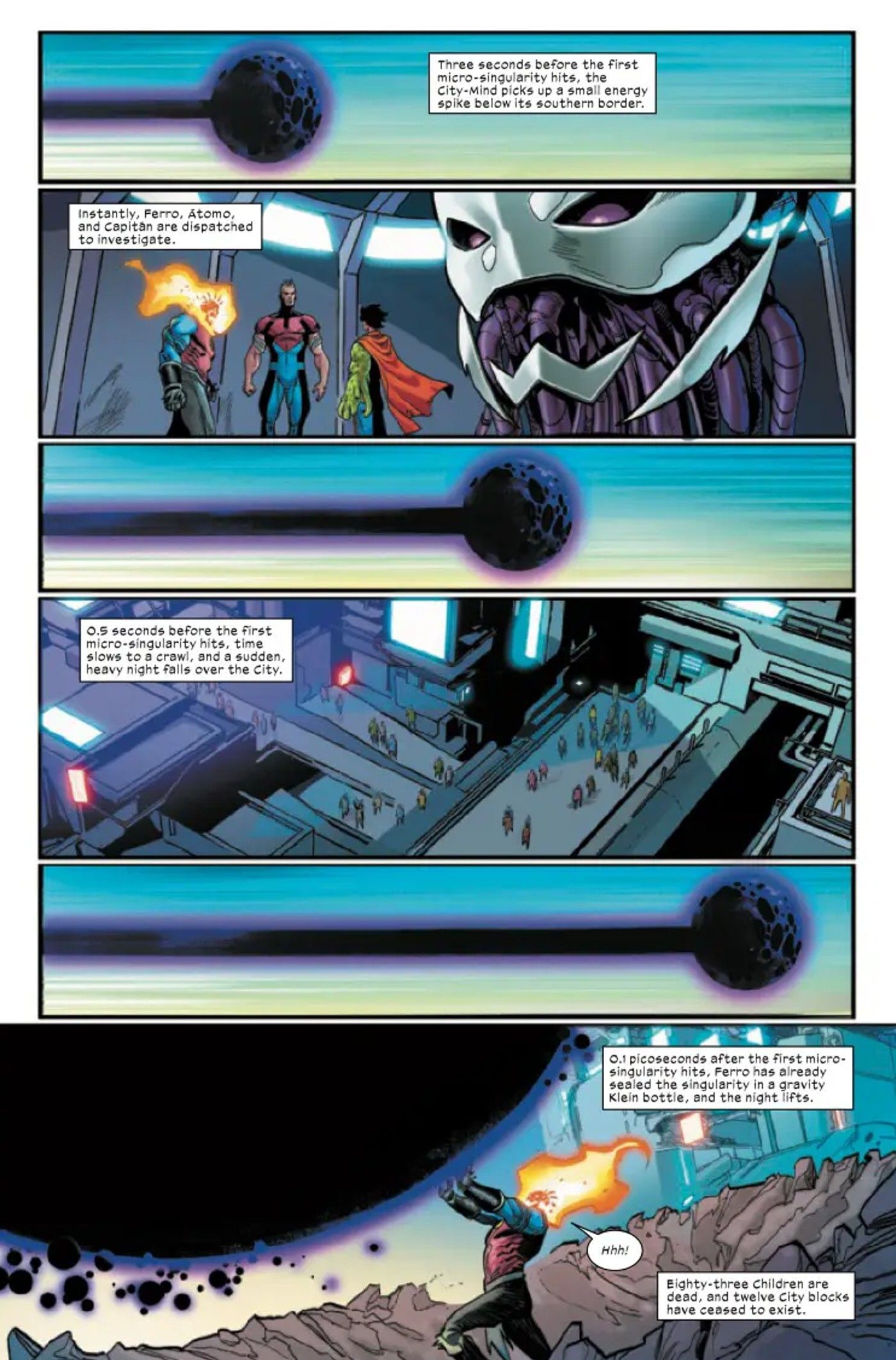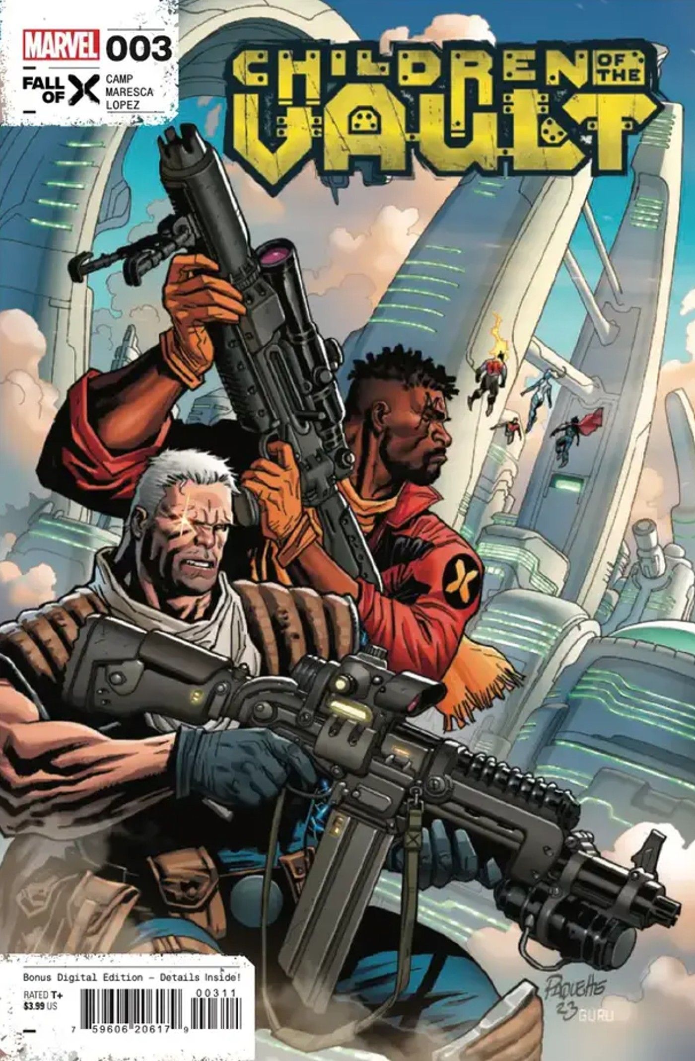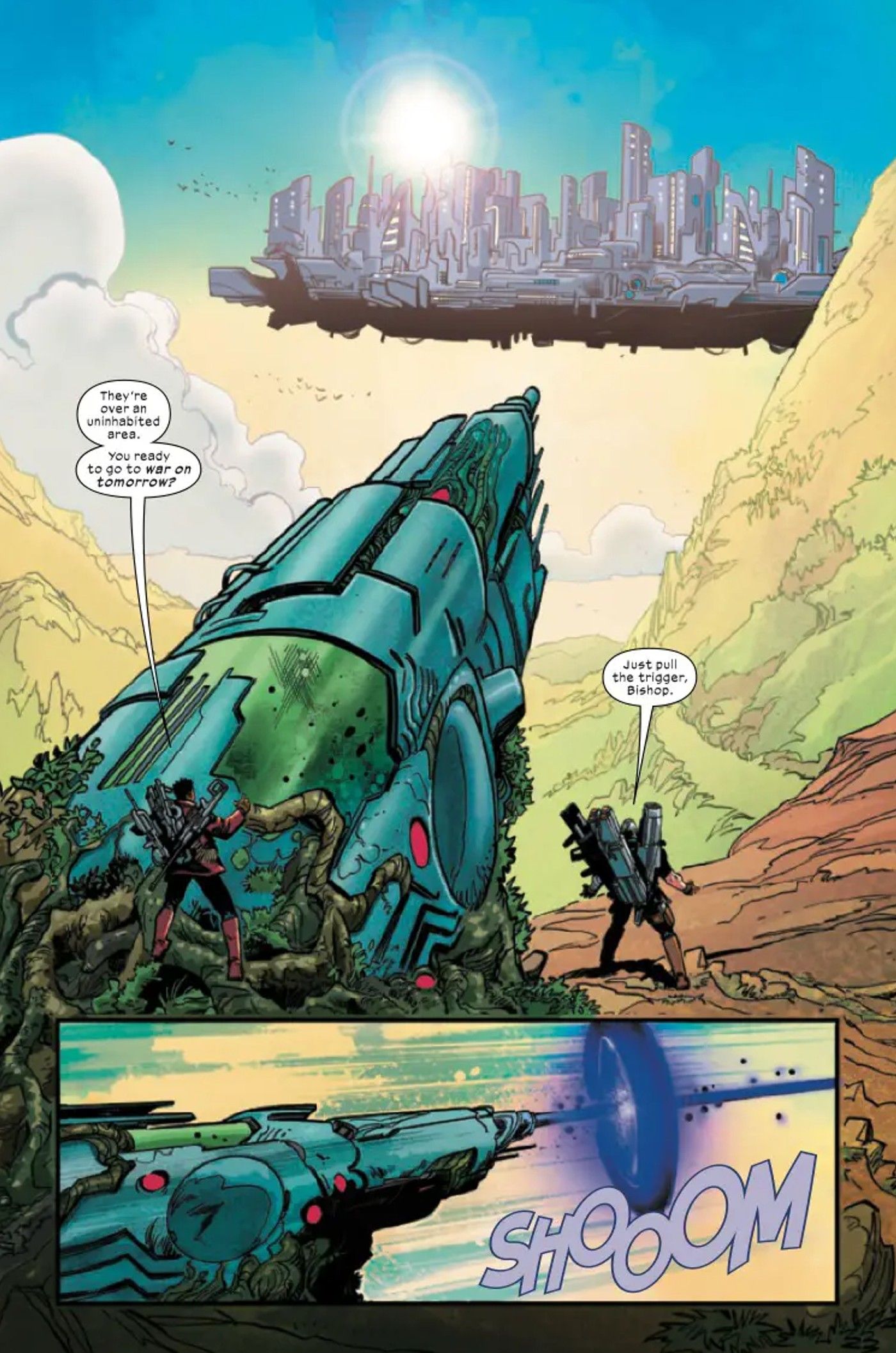 En un avance de Deniz Camp, Luca Maresca, Carlos López y Cory Petit’s Hijos de la Bóveda #3 compartido por Marvel, Cable y Bishop continúan su asalto a los Niños disparando balas de microsingularidad (agujeros negros armados) a su base flotante. En respuesta, los Niños despliegan a sus ‘héroes’.
