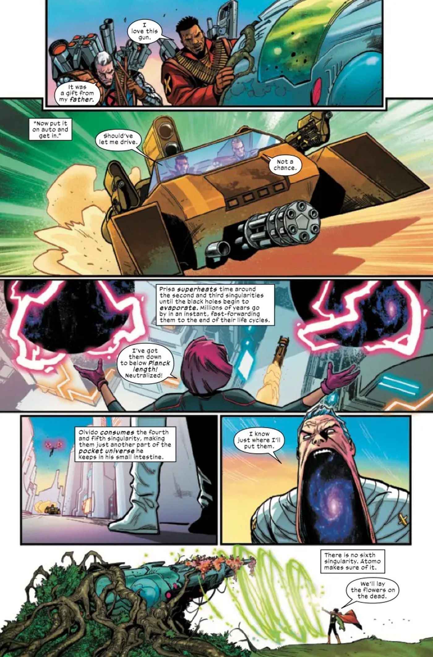 Cable y Bishop tienen una fecha límite: el plan de los Niños es implementar un proceso que acabará con la mayoría de la vida en la Tierra y al mismo tiempo convertirá a los pocos humanos que quedan en miembros de su especie. Con este asalto confirmando que al menos tres de ellos pueden enfrentarse a un agujero negro y triunfar, ese plan hasta ahora continúa sin problemas. Para salvar a la humanidad y a los mutantes, el X MenCable y Bishop necesitarán un plan, y un arma, que pueda acabar con el mal de Marvel. Destello… y luego cientos de miles más como ella.