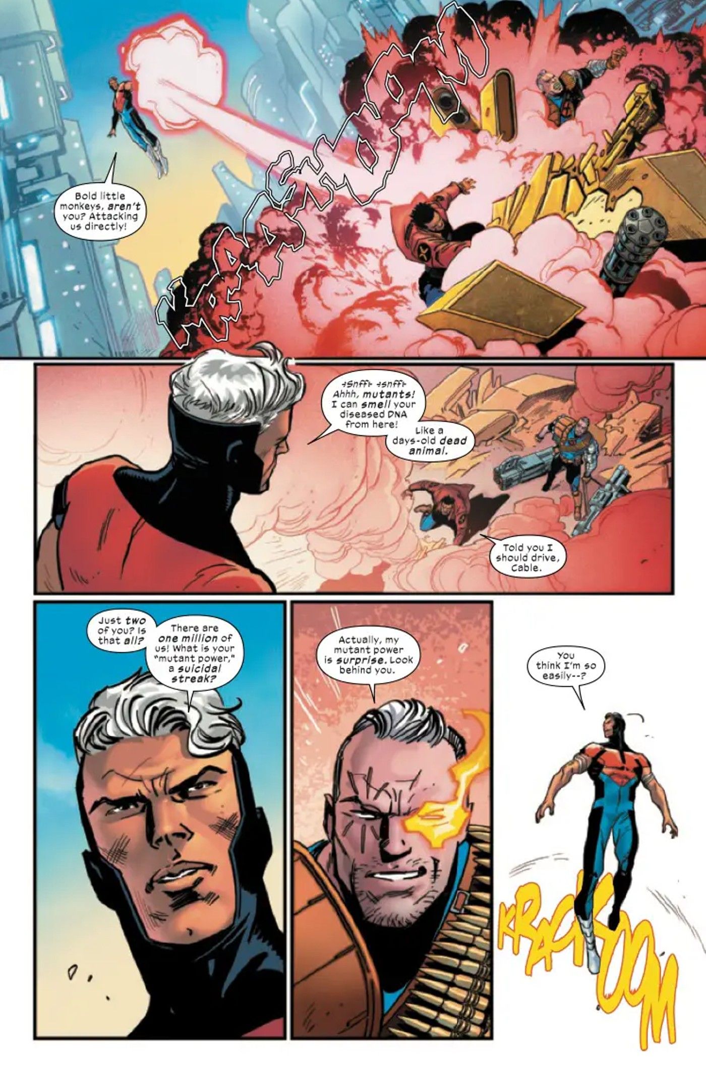 Sin embargo, con el resto de los X-Men muertos o dispersos por la galaxia, y los héroes humanos infectados por un virus que los empuja a confiar en los Niños, Cable y Bishop son todo lo que queda para enfrentar la amenaza planteada por los Niños de la Bóveda. Ninguno de sus poderes se acerca al malvado nuevo Flash de Marvel. Cable tiene increíbles habilidades telequinéticas y telepáticas, y Bishop puede absorber y redirigir energía, pero ninguno de los dos tiene ninguna protección contra el envejecimiento a un ritmo que vuelve inofensivo un agujero negro en segundos. Lo que los dos sí tienen es un arsenal de armamento futuro y la astucia de los soldados que lucharon para salir de sus respectivos futuros apocalípticos, pero su último asalto sugiere que no tienen un plan concreto para poner fin a la amenaza que representan los Niños.