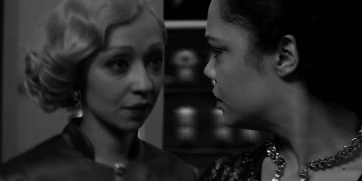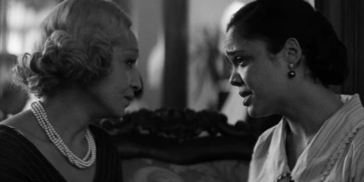 En la película, Irene de Tessa Thompson y Clare de Ruth Negga fueron amigas desde la infancia hasta la muerte del padre de Clare, lo que la llevó a alejarse de su comunidad en Chicago y perder el contacto con sus compañeros. Aunque al principio su reencuentro no es más que dos mujeres reavivando su amistad, parece que cuanto más tiempo están en la vida de la otra, su relación platónica evoluciona hacia algo más, para Irene, al menos. Al igual que la aventura de Brian y Clare, la atracción de Irene hacia su amiga no se confirma explícitamente en Paso. Sin embargo, las miradas furtivas de Irene insinúan un afecto más profundo que la amistad. Aparte de los sugerentes ángulos de cámara que resaltan cómo Irene ve los rasgos de Clare, la primera de vez en cuando deja escapar cumplidos que contienen un mayor nivel de admiración y atracción potencial.