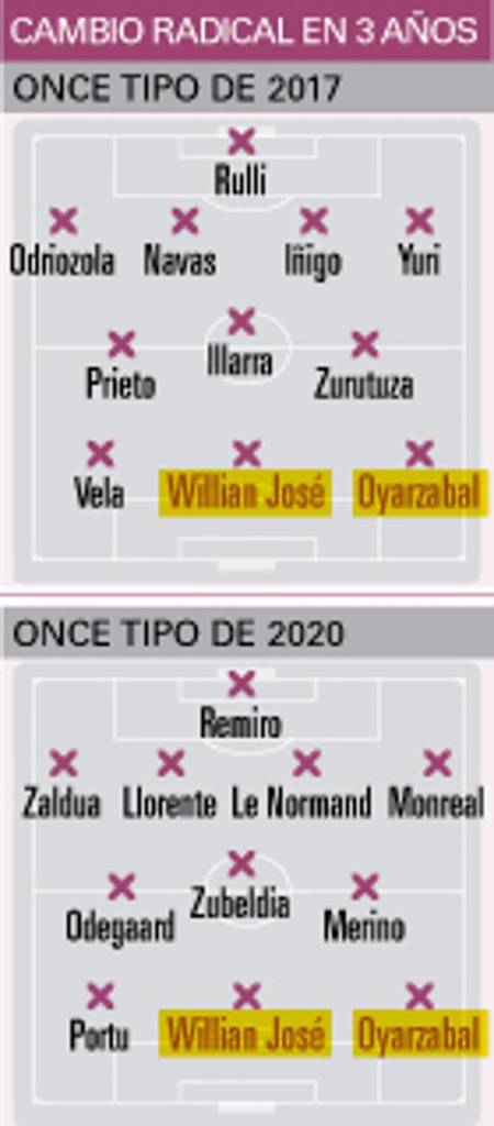 Sólo han pasado tres años y parecen recuerdos de una época pretérita. El fútbol se parece a un torbellino que arrasa con todo aquello que se encuentra a su paso. La Real que en 2017 se clasificó por última vez para Europa no tiene demasiado en común con la que ahora aspira a reeditar el mismo éxito. El cambio es radical y hay una diferencia de 36 meses.