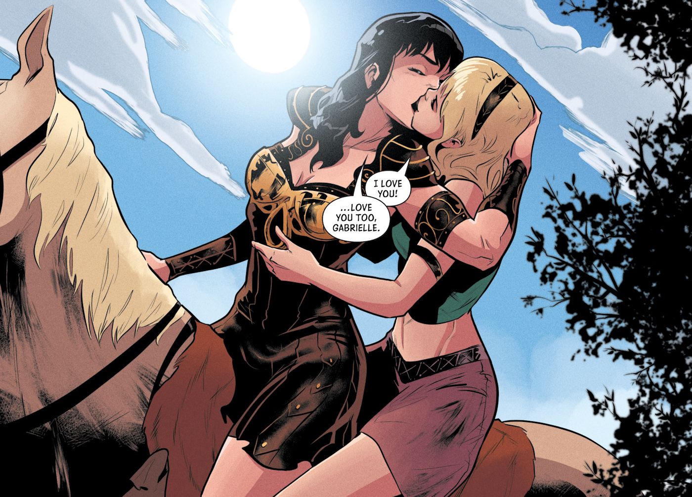 Xena: princesa guerrera #2, del equipo creativo de Vita Ayala, Olympia Sweetman, Vasil Georgiev, Rebecca Nalty y Ariana Maher, establece definitivamente a Xena y Gabrielle como amantes, con el primer número de la secuela del cómic que presenta a la pareja durmiendo juntas en la cama, y ​​el siguientes números que representan un beso fundamental en continuidad.