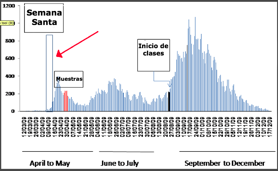 “Se observaron tres oleadas de actividad de la gripe: Se produjo la primera oleada entre abril y mayo, la segunda ola se llevó a cabo entre junio y julio y la tercera, entre septiembre y diciembre”. Las líneas en rojo muestran los días en que se recogieron las muestras utilizadas en el estudio y la Pasión de Iztapalapa está señalada en un rectángulo blanco una flecha roja.