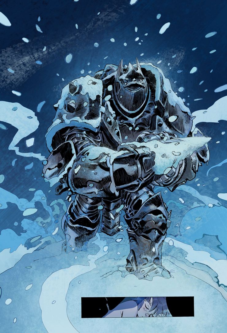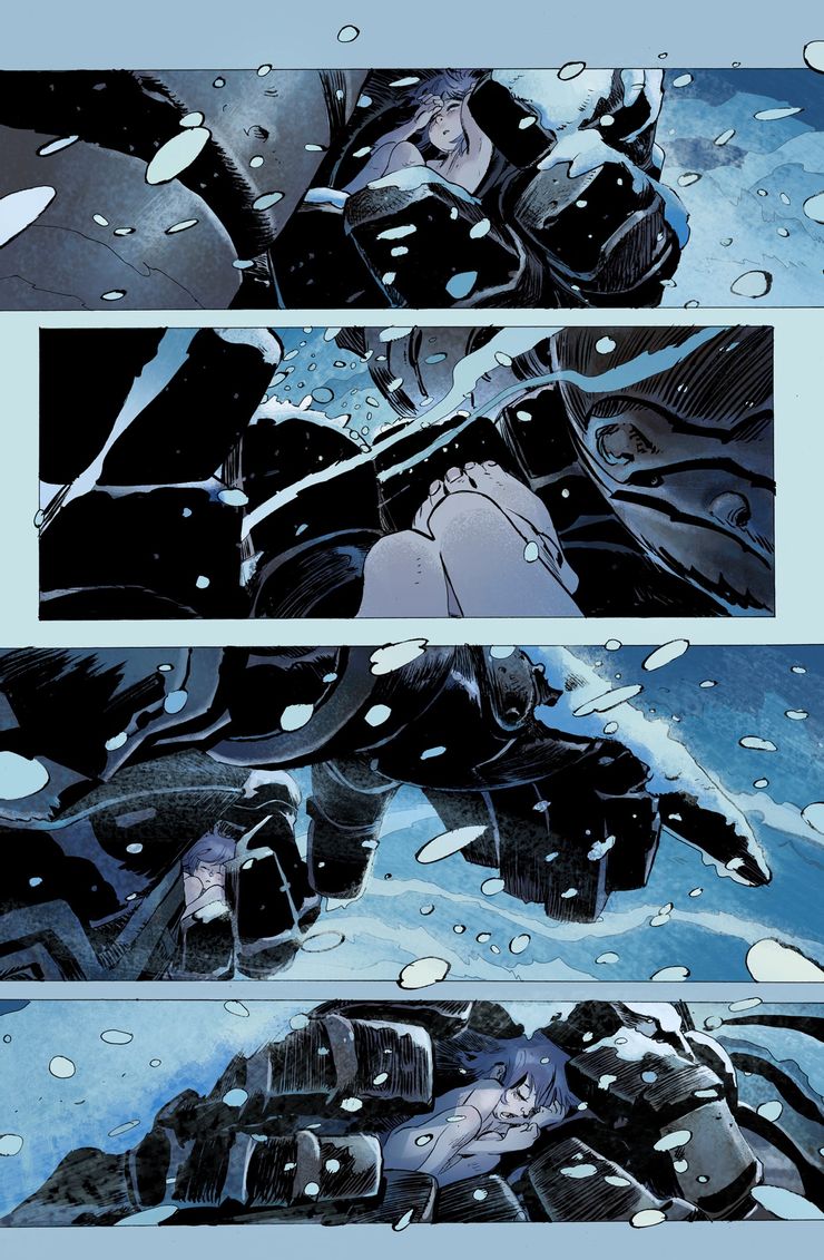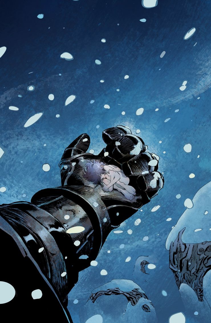 La historia comienza de manera bastante abrupta: habíamos discutido hacer algunas páginas adicionales para expandir la llegada del Guerrero a la escena minutos antes de nuestra página 1 real, la gran mano levantando a la Chica por primera vez, pero de alguna manera se sintió mejor. opción más fuerte para tener este mismo momento como la pieza central de la primera página. Ningún andamiaje contextual construido a su alrededor innecesariamente. Esta secuencia fue todo un desafío para dibujar y colorear, ya que sucede durante una tormenta de nieve en la noche y el equilibrio entre la oscuridad y la legibilidad tuvo que decidirse cuidadosamente en cada panel. El caos y la confusión -como en todo nacimiento- fueron claves aquí.