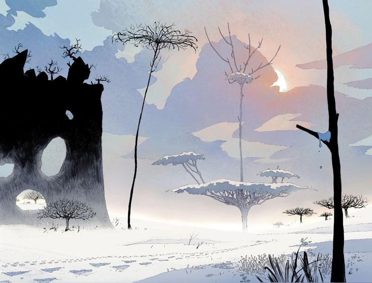 Una de las mayores sorpresas que encontramos en el camino fue el descubrimiento de que cuando lees un cómic mudo, no es más rápido ni menos atractivo que uno lleno de texto. Todo lo contrario. El ojo está constantemente vagando, explorando, habitando. La mente inconsciente está absorbiendo detalles en un frenesí. Una vez que se establece ese impulso, puede ser increíblemente hermoso y sorprendentemente intenso. Entonces aprendimos a incorporar momentos como este. Vistas de quietud y silencio, que no solo rompen capítulos de la historia, sino que actúan como suspiros de serenidad, dando a la mente del lector la oportunidad de respirar.