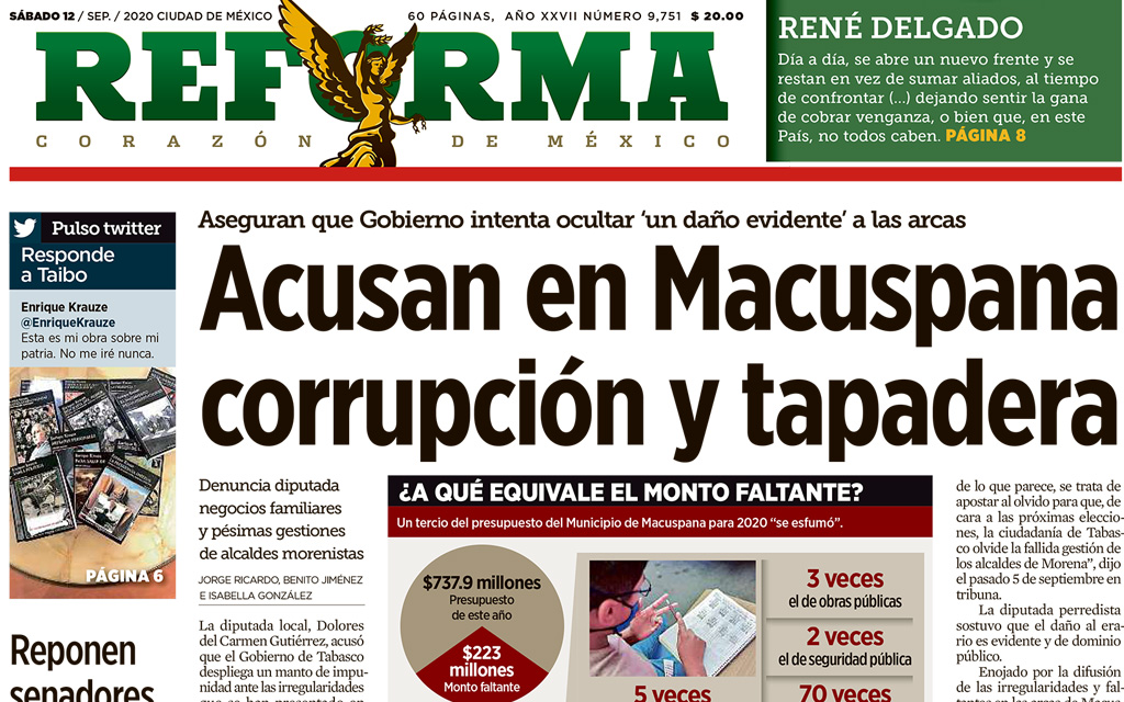 Este sábado, Reforma retomó el tema en su portada, con la nota ‘Acusan en Macuspana corrupción y tapadera, en la que se recogen las declaraciones de la diputada local Dolores del Carmen Gutiérrez. La legisladora perredista acusa al gobierno de Tabasco de desplegar “un manto de impunidad ante las irregularidades que se han presentado en Macuspana y otros municipios gobernados por Morena”. Señala que quien encabeza el nuevo concejo municipal, Mauro Winzig, es un amigo del gobernador de la entidad.