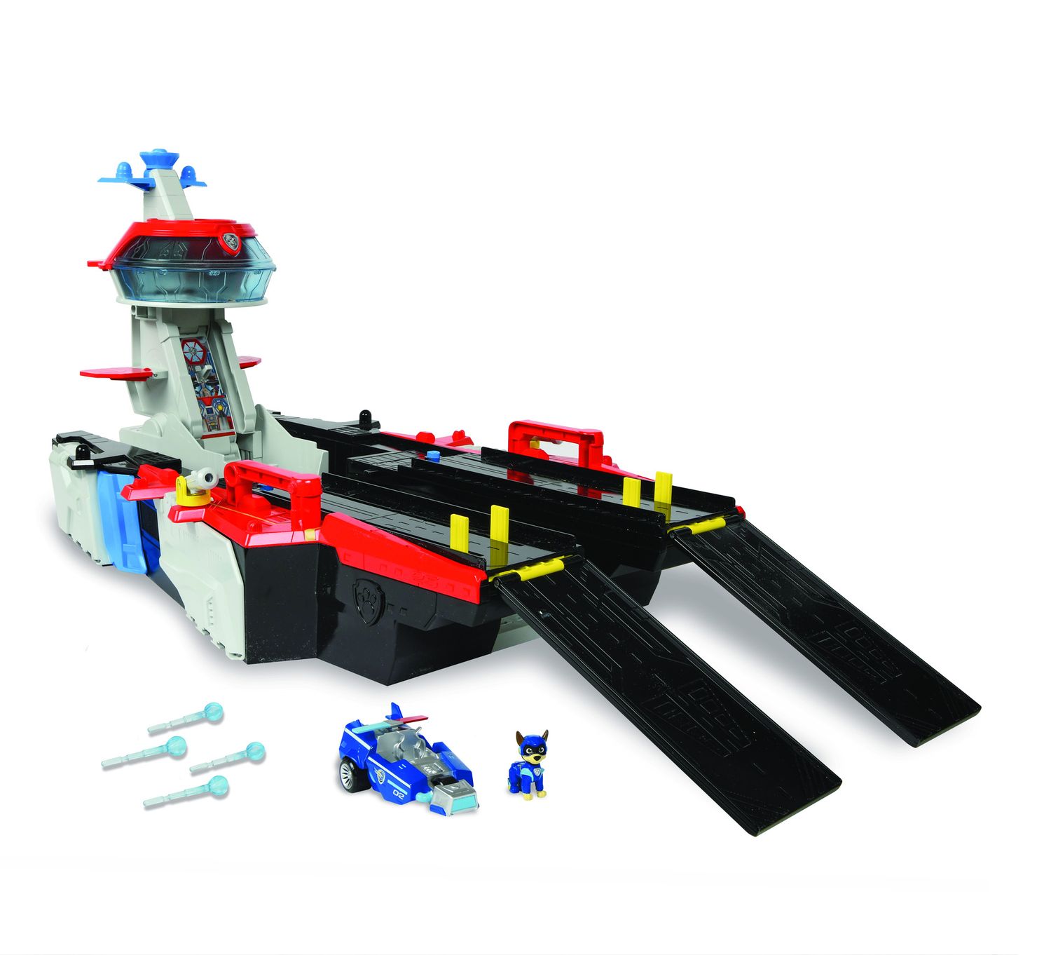 Presentando el Sede del portaaviones, donde comienza cada misión. Un juguete imprescindible para jugar todas las poderosas misiones de la película. El Portaaviones sede presenta una transformación apta para preescolares, lanzadores de vehículos duales y dos proyectiles a cada lado. Incluye luces, sonidos, música y frases de cachorros y viene con un vehículo Chase y una figura de cachorro. PVP $129,99 / Edades 3+