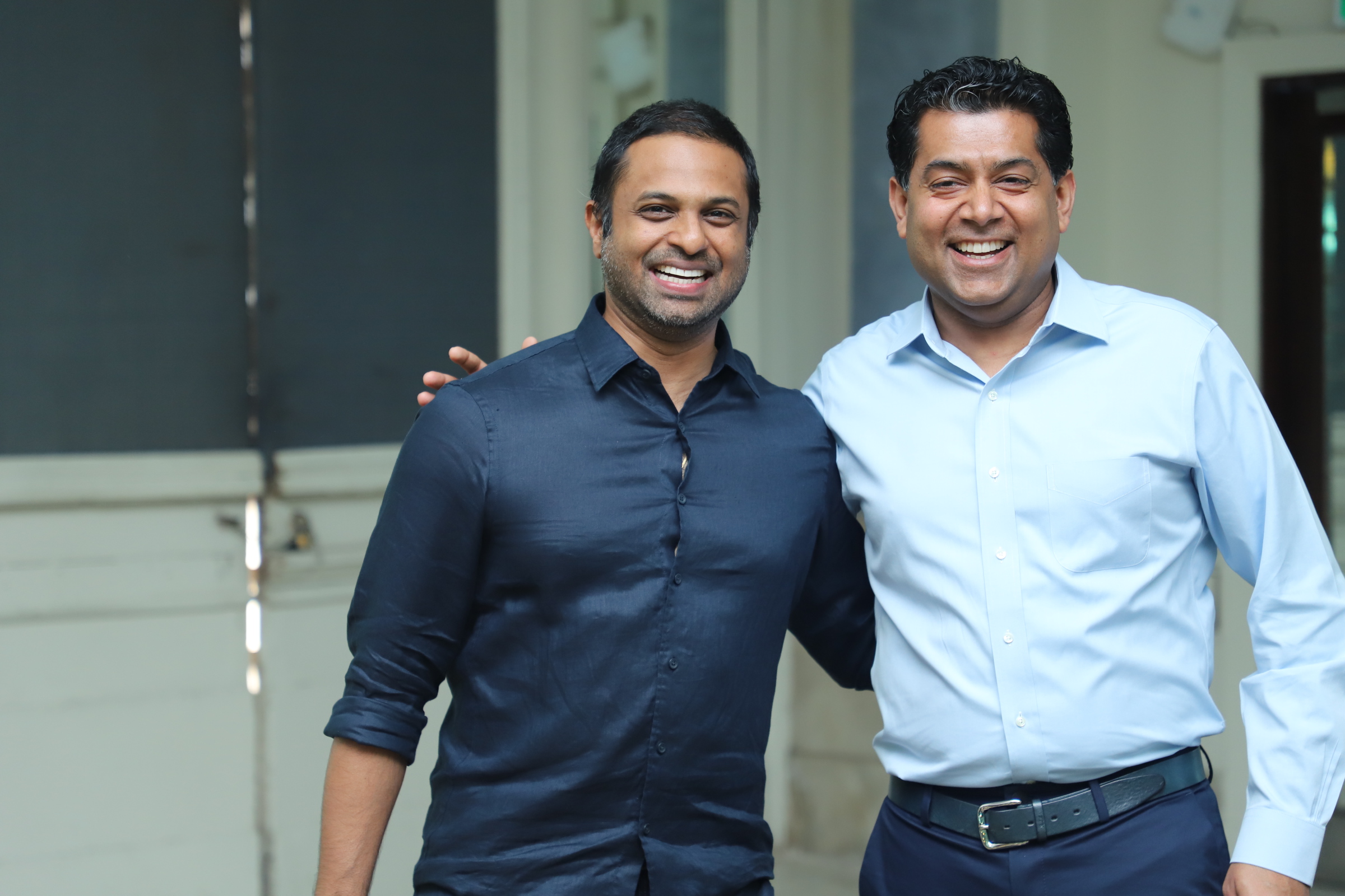 Prashanth Ranganathan de PaySense y Siddhartha Jajodia de PayU posan para una foto