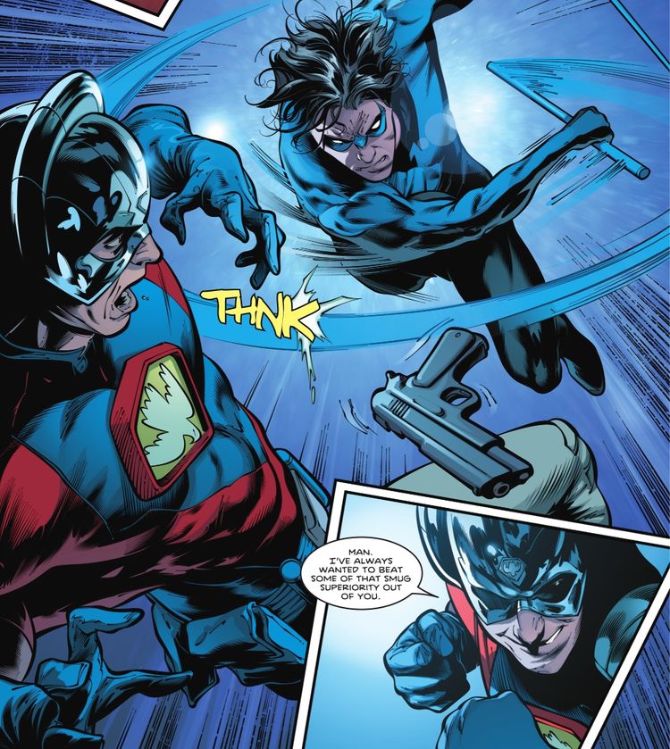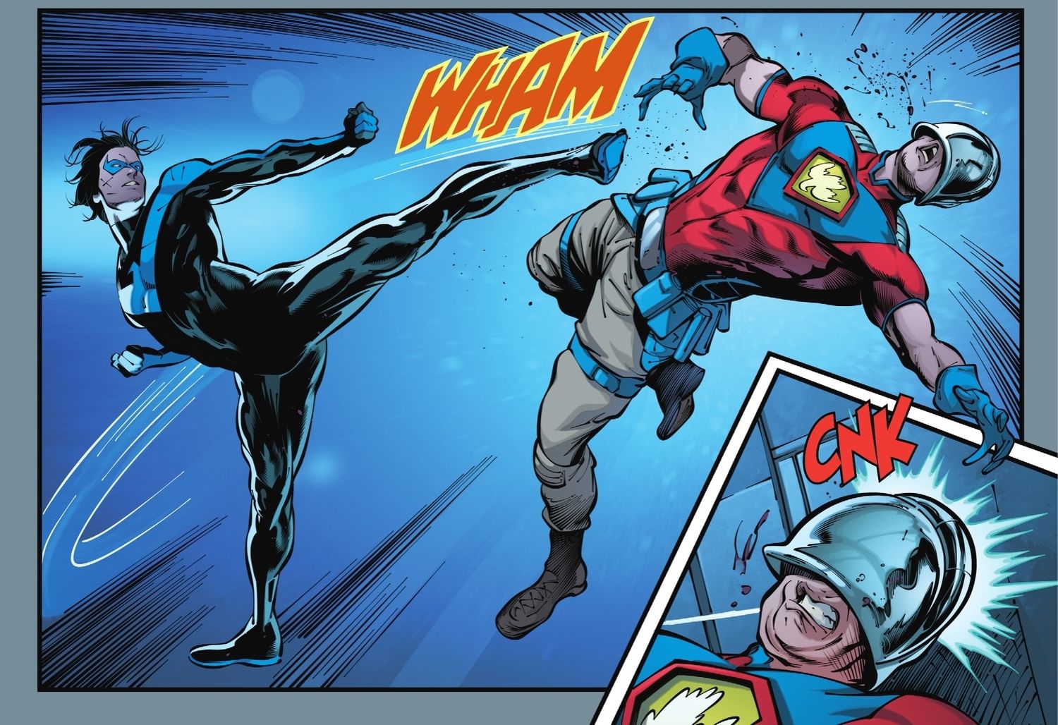 A pesar de declarar su intención de simplemente tener una conversación, Waller niega la solicitud de Nightwing de hablar e inmediatamente desata a Peacemaker sobre él, sumergiéndolos en una batalla feroz y brutal. En medio de su confrontación, Smith revela: “Siempre quise arrancarte algo de esa presumida superioridad..” Esta revelación no sólo expone el antiguo resentimiento de Peacemaker hacia Nightwing, sino que también revela que La raíz de su aversión por el héroe reside en su percepción del supuesto sentido de superioridad de Dick.