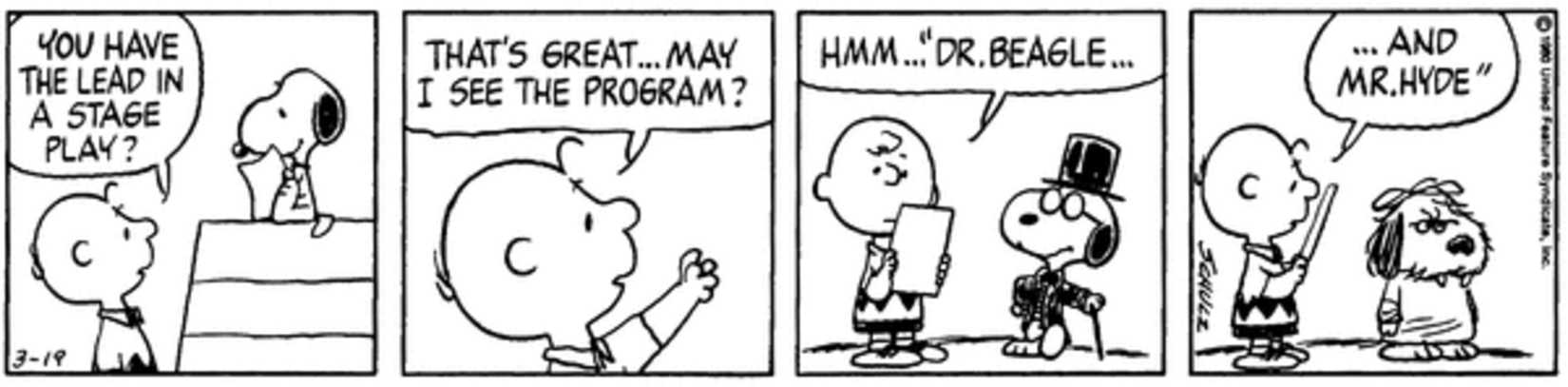 Obteniendo una referencia en MiseriaSnoopy toma el papel del Dr. Jekyll en una obra de teatro de la historia, mientras que el pobre Olaf se queda atrapado interpretando al feo y horrible Sr. Hyde. Sin duda, interpretar al Sr. Hyde no ayudará a la imagen de sí mismo de Olaf después de haber sido el ganador de un concurso de Ugly Dog.