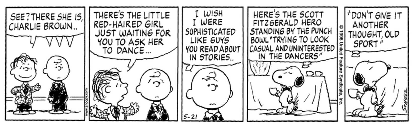 Cuando Snoopy acompaña al baile escolar de Charlie Brown, actúa como su nuevo alter ego, “El héroe de Scott Fitzgerald.” Como su nuevo alter ego, llama a la gente Viejo Deporte, como lo hace Jay Gatsby, y actúa de manera muy sofisticada, vistiendo también el papel. Snoopy, como su personaje mundano, termina bailando con el amor no correspondido de Charlie Brown, la Niña Pelirroja.