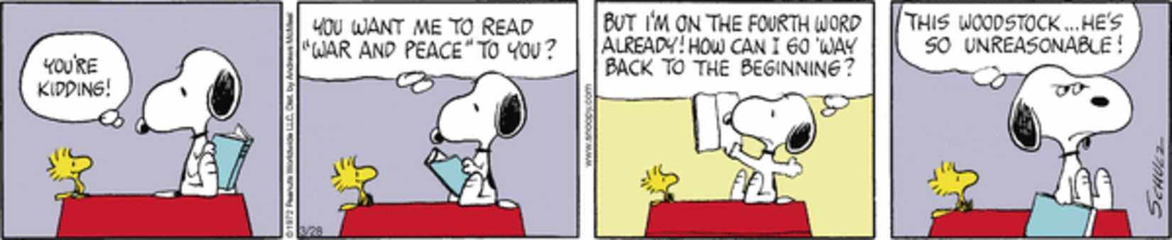 Es una característica bien reconocida de Snoopy que está leyendo Guerra y pazhaciéndolo una palabra a la vez. Dado que ya comenzó la gigantesca novela, sería una gran pregunta si alguien quisiera que comenzara de nuevo. Sin embargo, su estrategia de lectura ha asegurado que Snoopy sólo esté en la cuarta palabra. Pero eso ya es demasiado para Snoopy, burlándose de la petición de Woodstock de leerle la historia desde el principio.